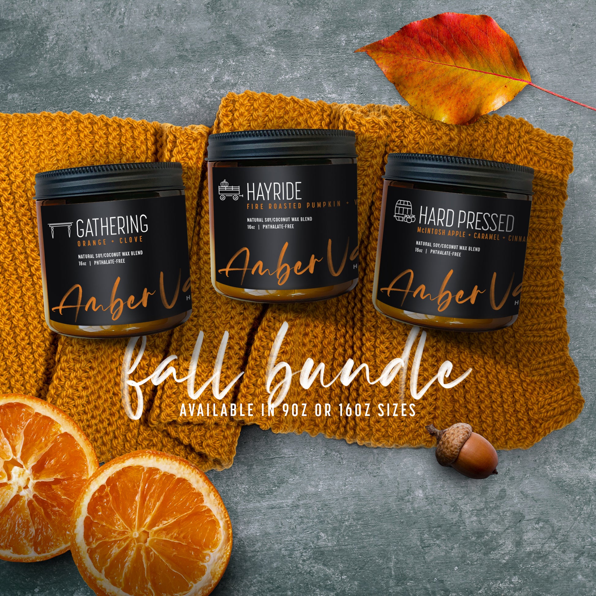 Fall is the perfect time to capture the warmth and glow of a candle and look no further than our Fall Bundle. Created to perfection with Hard Pressed (McIntosh Apple + Carmel + Cinnamon + Bourbon), Hayride (pumpkin + vanilla) and Gathering (orange + clove), these three are sure to remind you of the essence that this time of year brings our homes at a low bundle price.