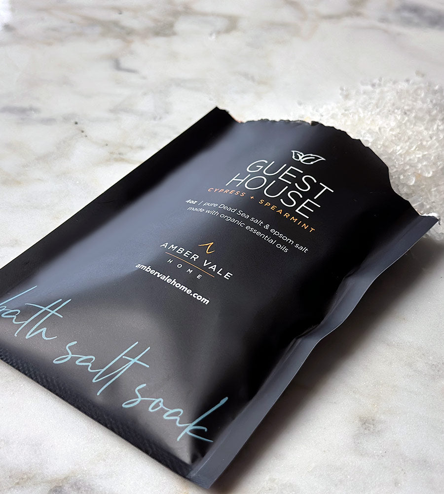 Made with Dead Sea salt harvested from Israel, this salt is 100% pure. We’ve added epsom salt to ease muscle ache and tension that is of highest quality pharmaceutical grade with maximum purity standards. Essential oils that are 100% pure grade, organic certified and steam distilled create the perfect scent for relaxing moments. Each batch of our Guest House Bath Salt Soak is hand mixed and packaged with the same high standard of care that you’re used to at Amber Vale Home.