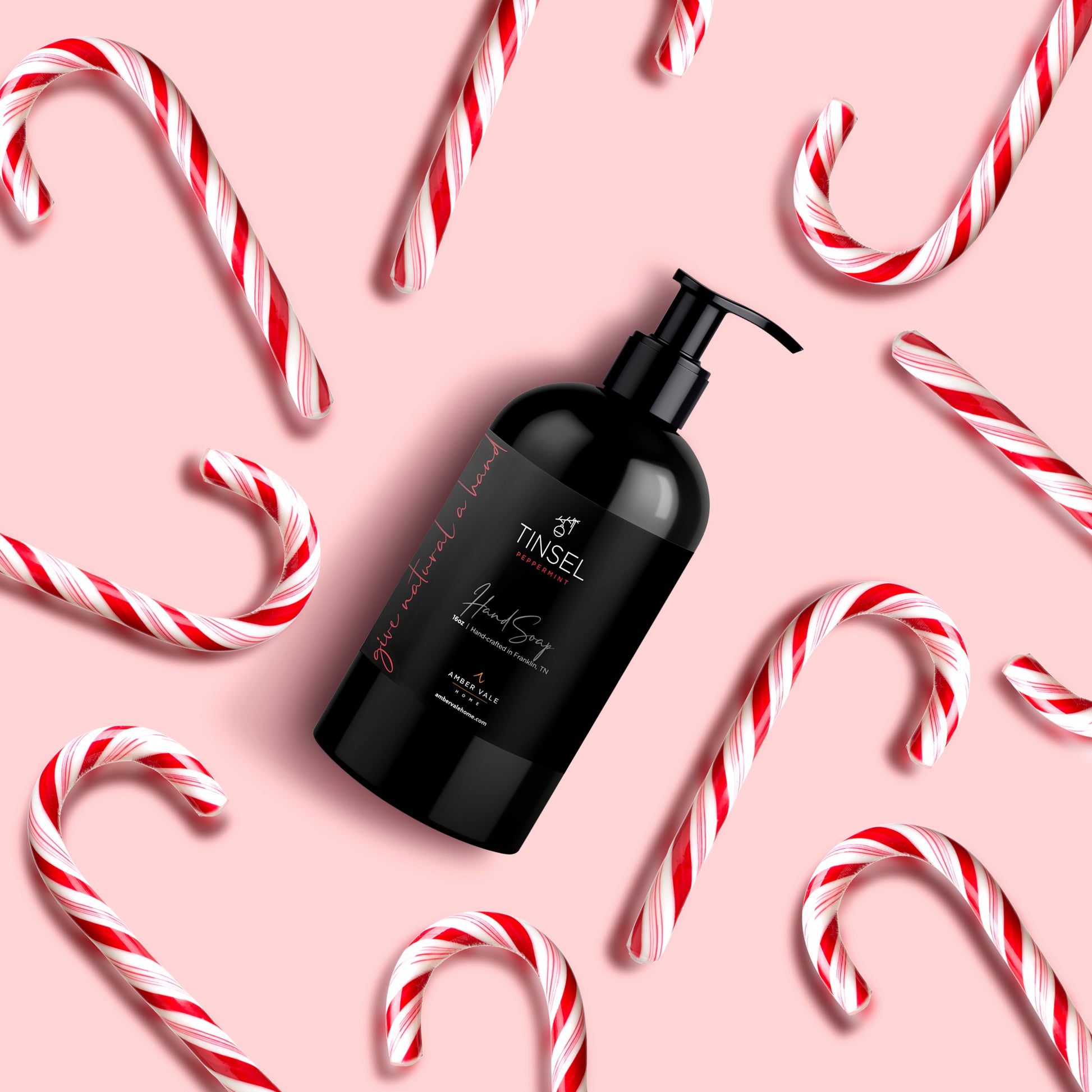 We’re excited to announce our latest hand soap just in time for the holiday season—TINSEL! It’s a soothing, crisp peppermint scent with six organic ingredients added in to give you a natural, moisturizing clean. We wanted to create a hand soap that was not only made with organic and natural ingredients, but lathers well and leaves your skin feeling refreshed and moisturized. Done! Made with certified organic olive oil, coconut oil, sunflower oil, shea butter, aloe vera juice extract and rosemary extract — all in a generous 16oz size. You will find yourself wanting to wash your hands over and over again!